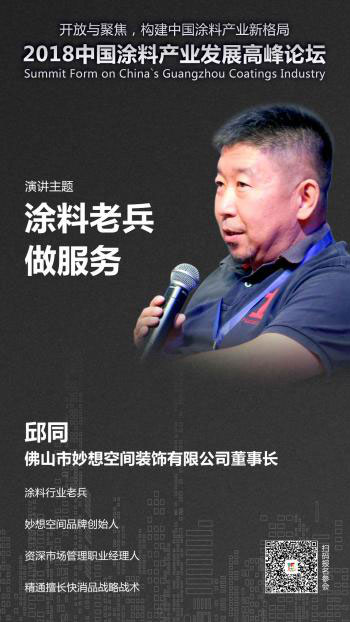 建筑世家、科班出身,在涂料市场搏杀25年。精通快消品战略战术,华润涂料多个区域销售总监。带领妙想空间团队专注墙面服务、扎实前行。将分享如何面对服务升级、用户体验升级,看待转型升级得失等。